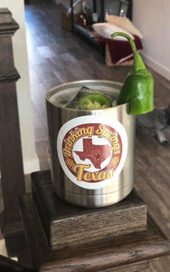 Normally in a tall slender glass, but a recycled Deep Eddy Jar works just as good. Salted rim optional.